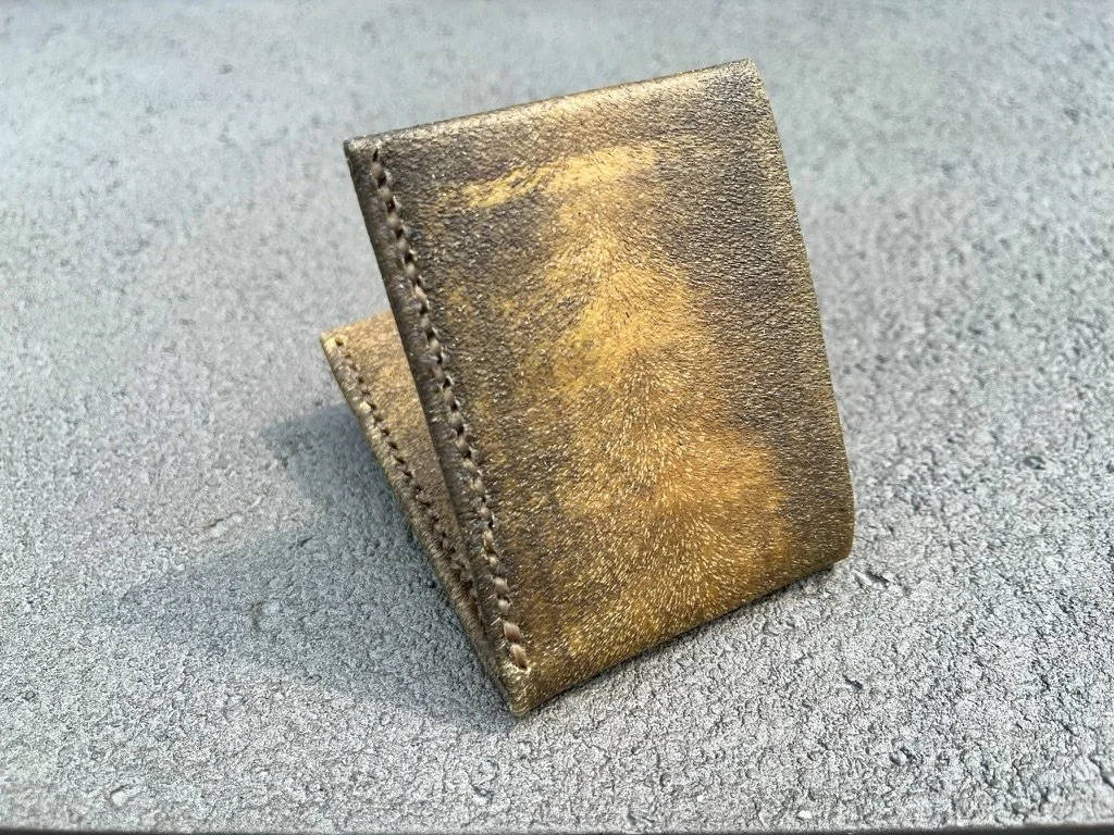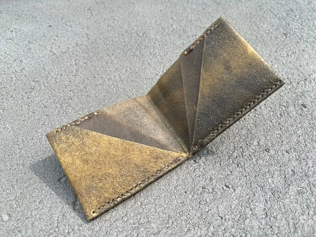 A bifold wallet constructed from a single piece of transparent horse leather. Due to the nature of this leather, each wallet is unique in appearance and texture. Each wallet is hand sewn with nylon sinew.