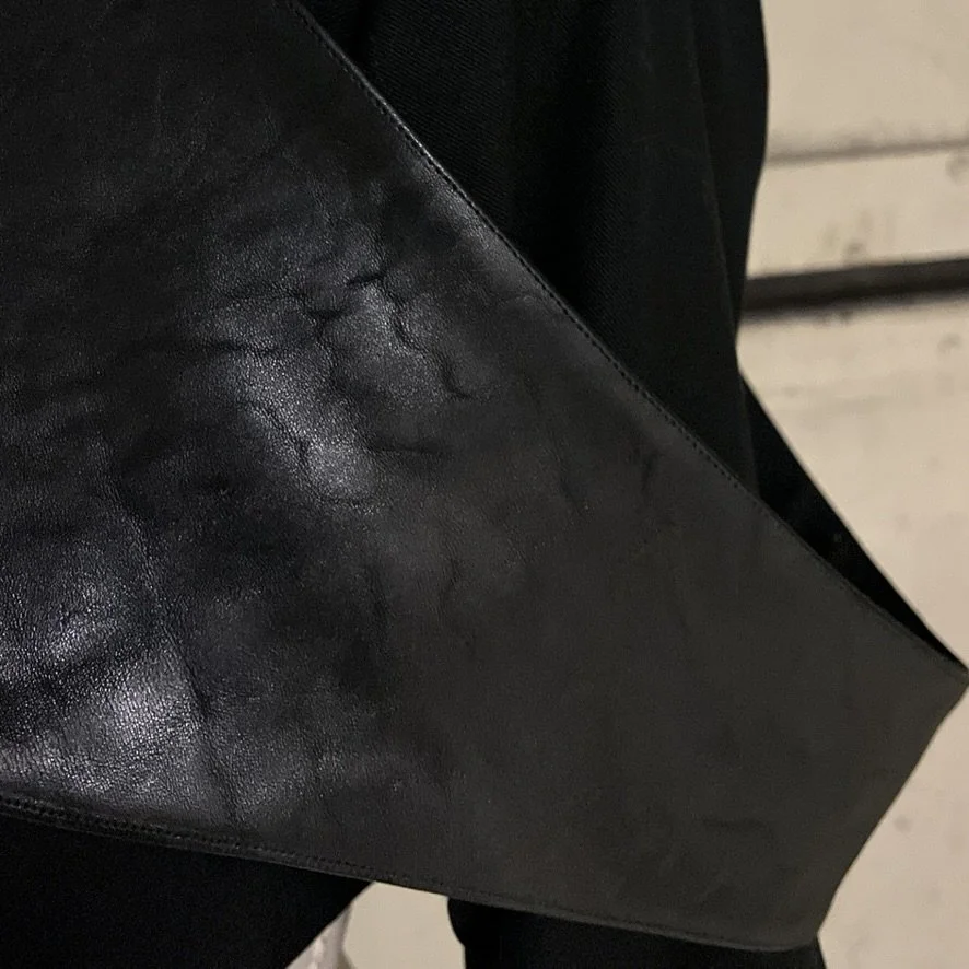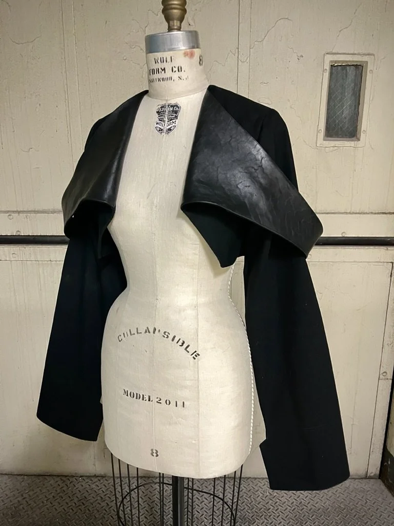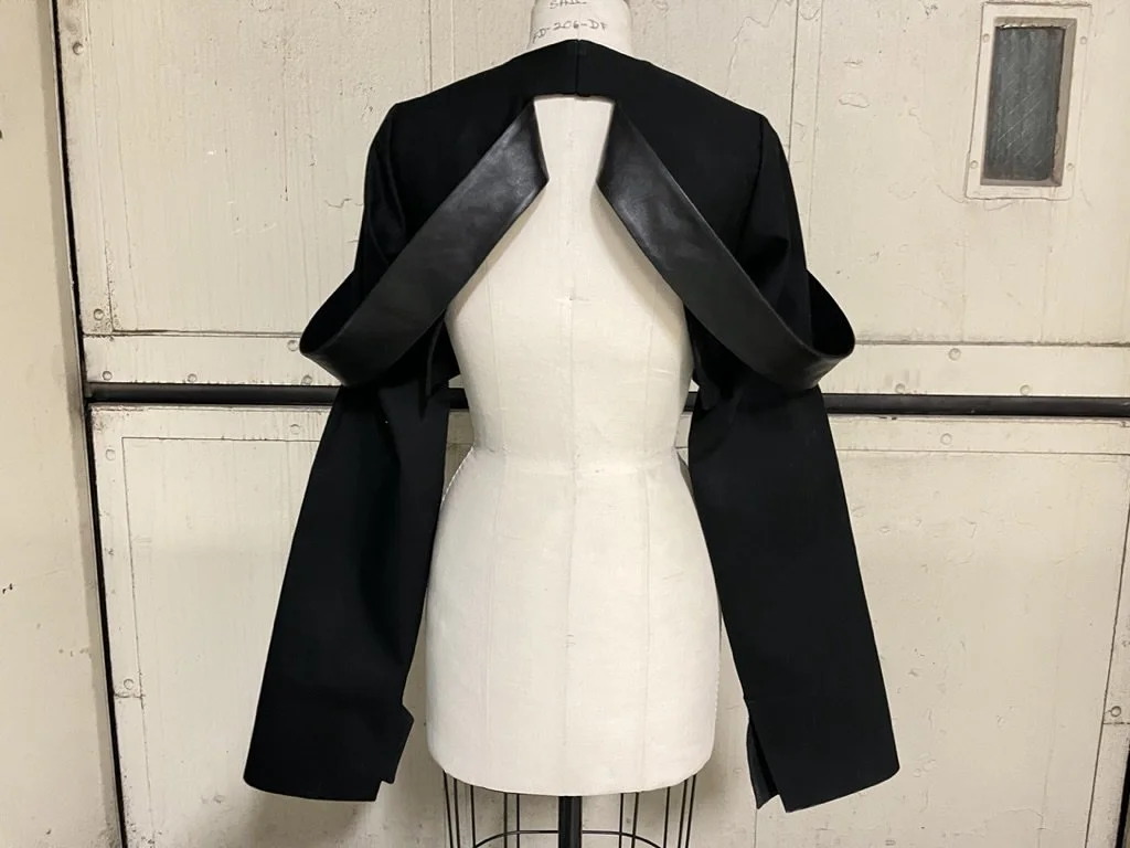 Cotton twill jacket with an extreme crop, Horween leather facing, open back, and flared sleeves. This jacket features a peeling, wrap-around detail. This garment was transformed into a cicada variant.